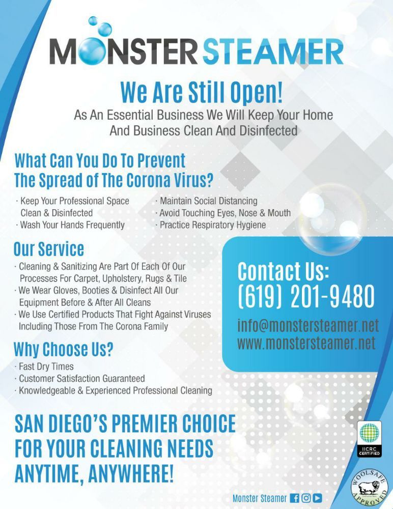 One carpet at a time. Monster steamer has updated their hours and services. Monster steamer carpet cleaning services in san diego has been built by word of mouth referrals from the very beginning in 2010. Carpet cleaning oceanside is insured licensed and bonded and we provide the 1 rates crew in oceanside ca.
