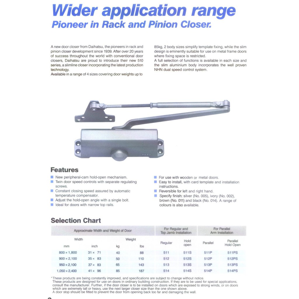 The new nhn 80v series offers a comprehensive range of hydraulic power adjustable door closers to suit all applications. The nhn door closer model 510 is specially designed for 20 up to 80 kg doors. Door closers online nhn 80v series. Power adjustable by spring size 2 4 no 83v size 3 6 no 85v and size 6 7 no 87v.