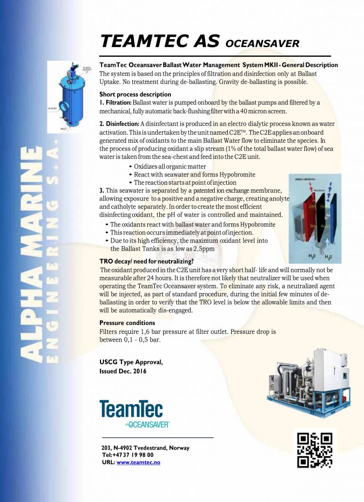 Provided mepc 64 inf 4 mepc 58 23 paragraph 2 10. Following the bankruptcy of the former oceansaver as in september 2017 teamtec gained control of oceansaver ballast water treatment system.